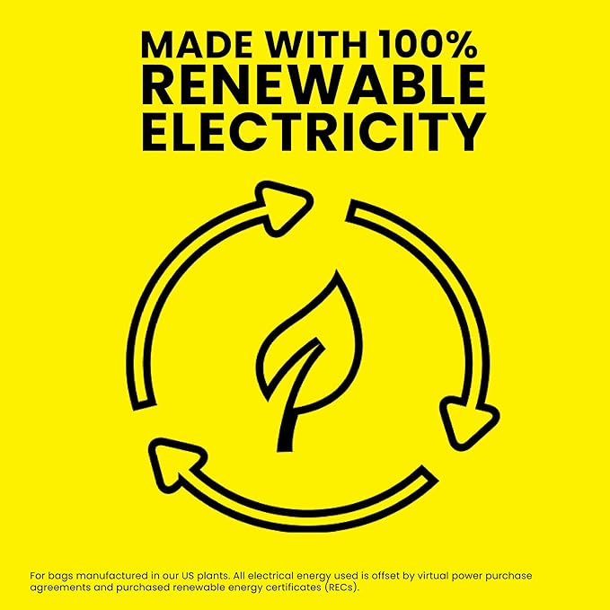 - MADE WITH 100% RENEWABLE ELECTRICITY*: For bags manufactured in our US plants, all electrical energy used is offset by virtual power purchase agreements and purchased renewable energy certificates