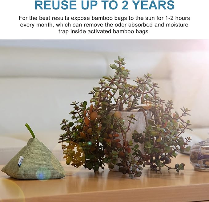 - COMPLETELY ECO-FRIENDLY - By ‘recharging’ your bamboo charcoal bags for an hour in sunlight every month, each bag can give you up to 2 years of air-purifying action. After 2 years of use, the bamboo charcoal in our air purifying bags make a wonderful addition to your garden, helping plants absorb moisture and nutrients. This completes its lifecycle as a product that comes from the earth and ultimately gives back to the earth.