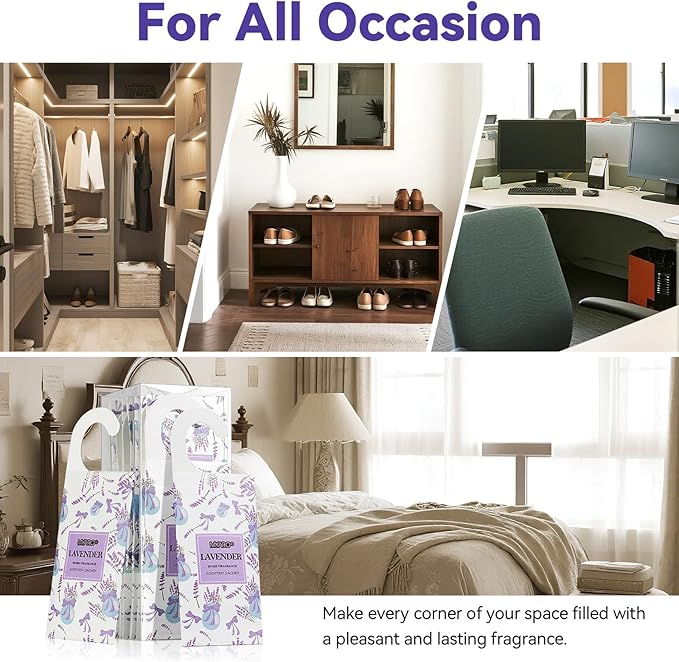 - MYARO 12 packs Scented Sachets for Drawer and Closet - Large sachets fill your home with fragrance. These large sachet bags have more essential oils added to it than the small, making the room freshener dissipate well and last longer. Lavender essential oil fragrance is infused into the sachet, and the sachet bag releases the scent for you to enjoy