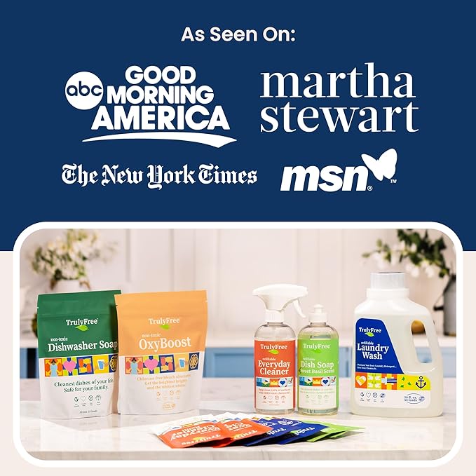 Truly Free Natural Concentrated Dish Detergent Dishwashing Liquid | Plant-Based Dish Soap | Sweet Basil Fresh Scent | 2 Refill Packs with 1 Empty Refillable Squeeze Bottle (16 Oz)