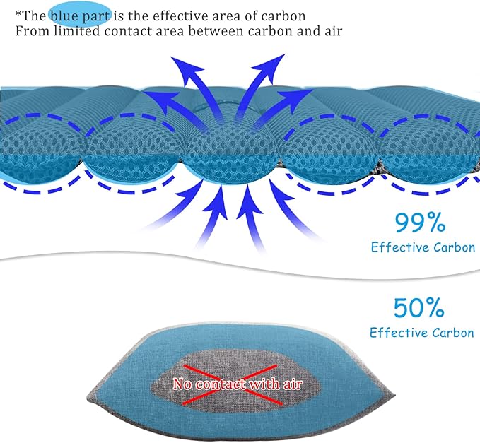 - 【Wavy Shape Design to Increase Air Contact Area】-After many times of debugging, our nature bamboo charcoal bag is finally designed into 8 small connected wavy reusable air purifier bag.Compared with a whole bag of the fresh air purifier bags,we are committed to making each activated carbon inside the air purifying bag pass through the air,so as to achieve maximum utilization,and increase the air exchange rate by 200%