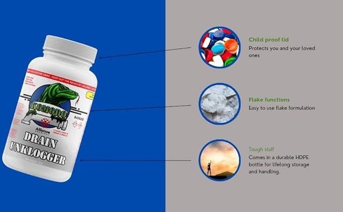 - 💪 𝐀𝐓𝐓𝐀𝐂𝐊𝐒 𝐁𝐋𝐎𝐂𝐊𝐀𝐆𝐄❗❗This fantastic product clears clogged and slow-moving drains, grease traps, and septic systems without harming septic or cesspools. Applied regularly, it enhances the growth of active bacteria. Because of its unique flake shape, KOMODO Drain UnKlogger will sink to the bottom of standing water and attack the cause of the blockage for a fast break-up.