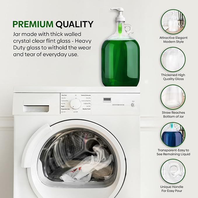 - Gallon Glass Bottle with Pump Dispenser: Enjoy convenient and mess-free dispensing with our gallon glass bottle and pump dispenser, perfect for laundry detergent, soap, or condiments. Get organized in style with this versatile solution.