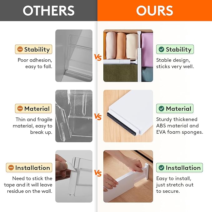 - Easy Installation & Removal: Press the top button to adjust the length before placing, and stretch it out again to secure it tightly before locking it. The strong spring tension keeps each drawer organizer securely upright. To retract, press the top button and push the stretched side