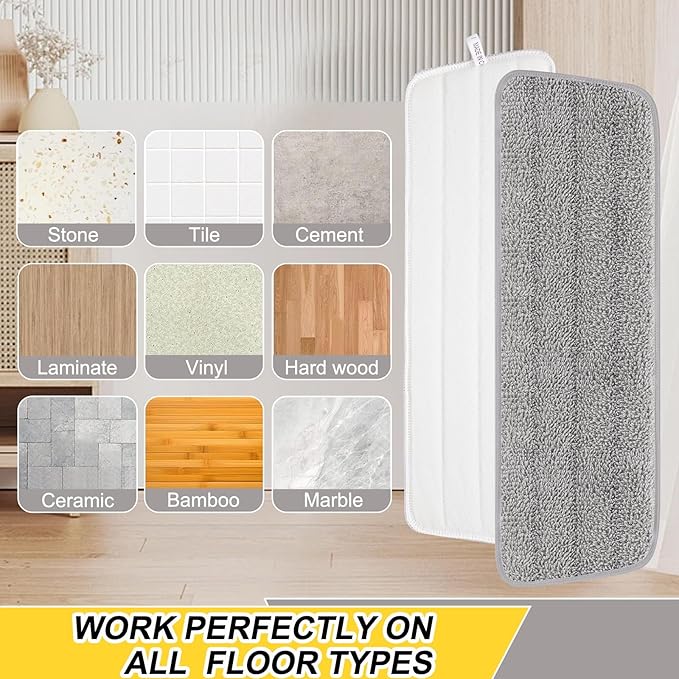 • Superfine Microfiber - Our spray mop heads adopt the high quality microfiber whose decontamination ability is further improved, fully absorb pet fur, hair, debris, dust, oil or other stubborn stain, durable and reusable.
