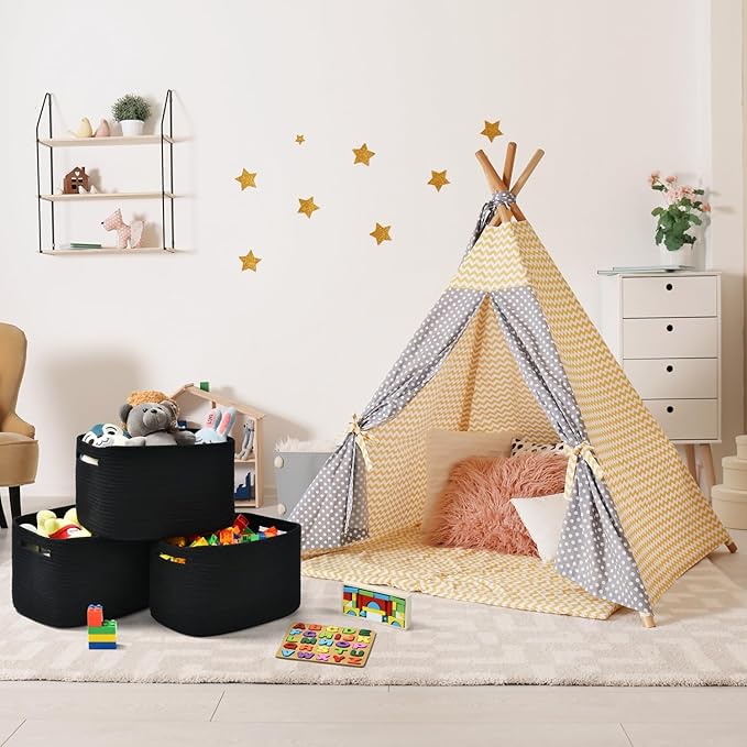 Storage Basket, Woven and Cotton Rope Baskets for Organizing, Decorative Book, Towel, Toy Baskets or Storage Bins for Living Room - 3 Pack, Black