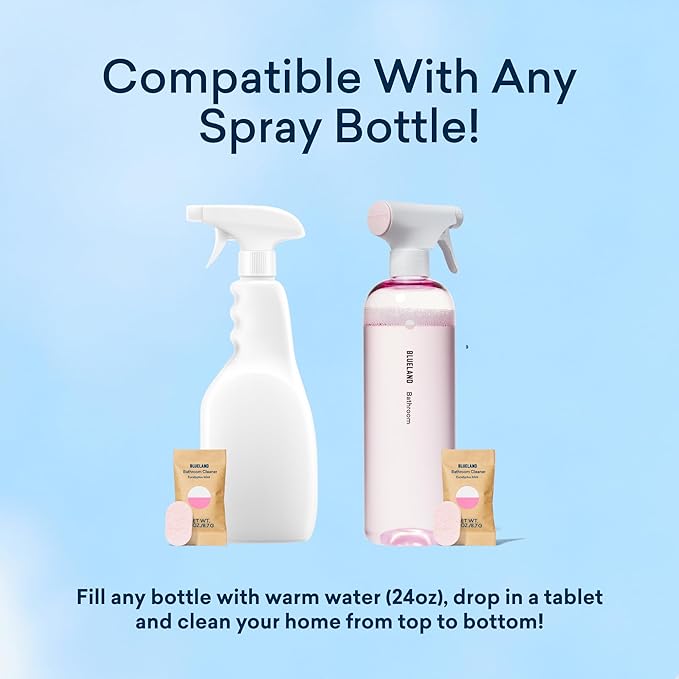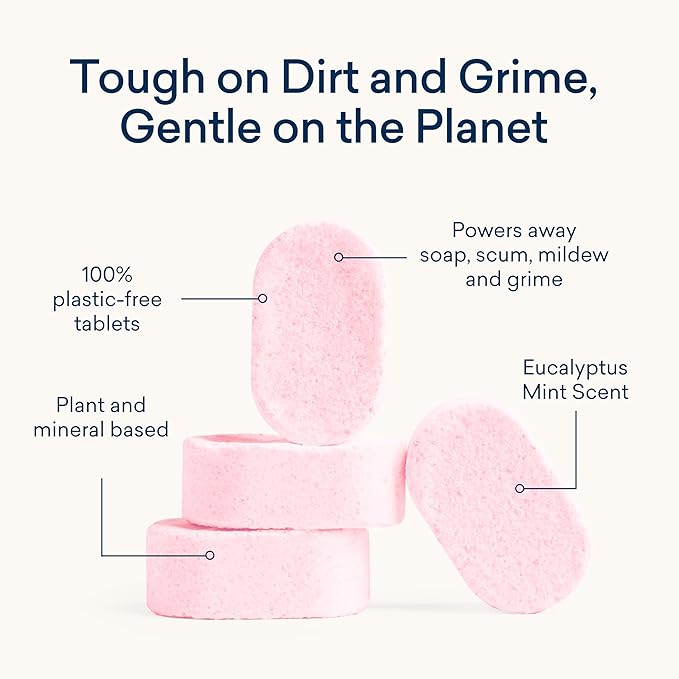 - REFILLABLE, AWARD-WINNING BATHROOM CLEANER. See ya, soap scum. Goodbye, harsh chemicals. Tackling the dirtiest space in the house just got cleaner. Our 100% plastic-free tablets are safer for your family, healthier for the planet, and proven tot get surfaces sparkling clean. Just fill your bottle with water, drop in a tablet and voila—you’re ready to clean from tub to tile.