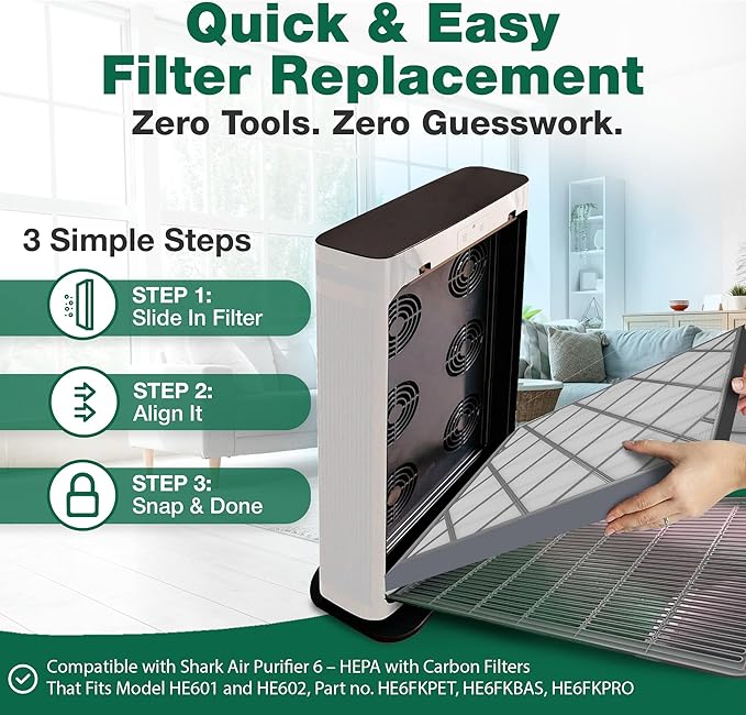 - Designed for optimal compatibility with shark air purifier filter enhances your purifier’s performance. Its dimensions are 24.6" L x 15" W x 1.6" Th, making it a perfect fit for part numbers HE6FKPET, HE6FKBAS, and HE6FKPRO.