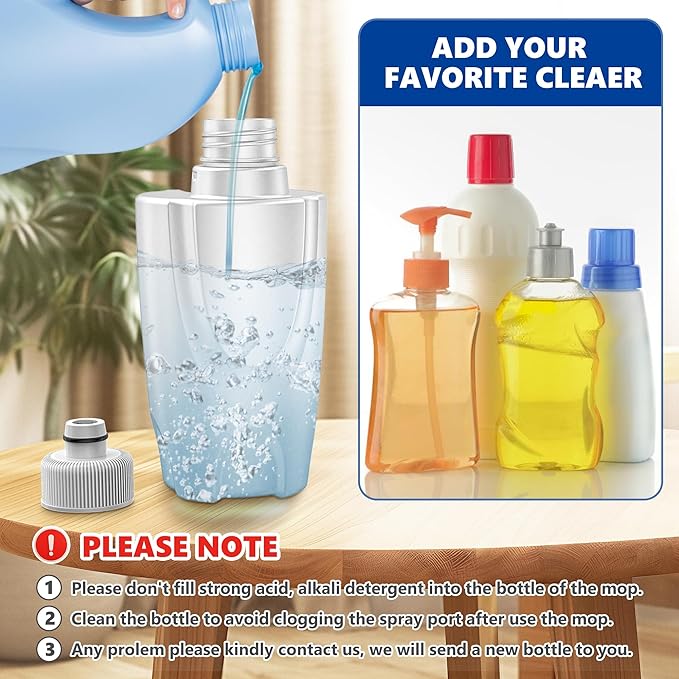 - Refillable bottle to add your favorite cleaning solution((do not add strong alkali, acid, boiling water ), do no need to carry a bulky mop bucket