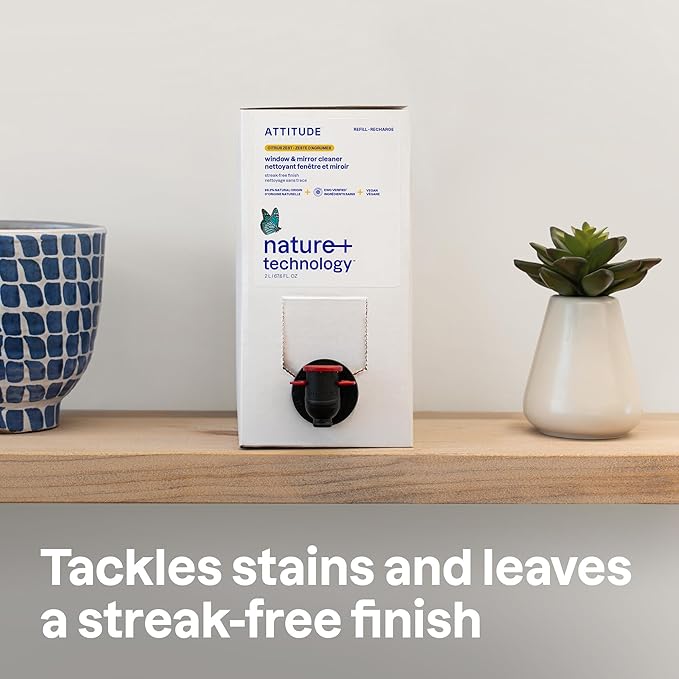 ATTITUDE Window & Mirror Cleaner Refill, EWG Verified, Plant- & Mineral-Based, Vegan & Streak-Free Glass Spray, Citrus Zest Scent, 67.6 Fl Oz