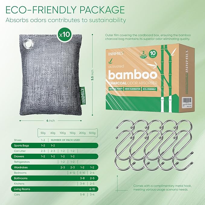 - JOIN OUR TREE-PLANTING INITIATIVE - With every purchase of an Innimily bamboo charcoal air purifying bag, we plant a tree in your name. This initiative supports reforestation and aligns your daily life with environmental sustainability. Not only do our products capture odors naturally, but they also contribute to a greener planet. We offer a no question asked money-back if you're not satisfied with odor eliminator for home