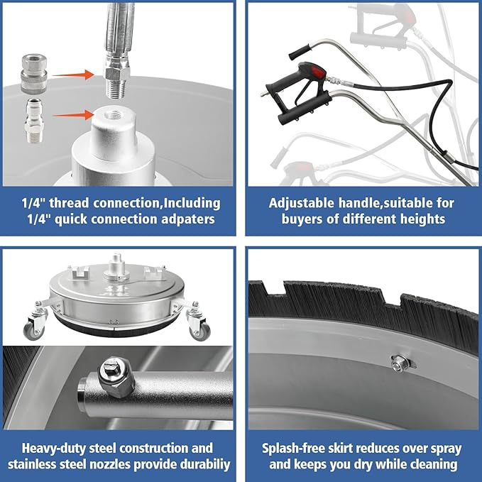 - PREMIUM QUALITY - Constructed with durable stainless-steel material and equipped with a heavy-duty bearing system, this cleaner ensures long-lasting performance. The splash-free skirt effectively minimizes overspray for a dry-cleaning experience. With adjustable dual-handles and 4 castors, it is easy to use and maneuver, saving you effort.