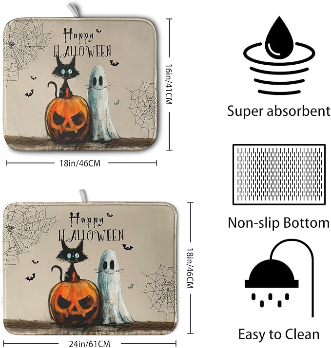 - 【Multifunctional Pad】Beautiful print on surface side, and reverses to a solid color. The halloween cat drying pad absorbs water well, great for air drying dishes, glasses, bottles, silverware, fruits and vegetables, adds stability when drying fragile items.