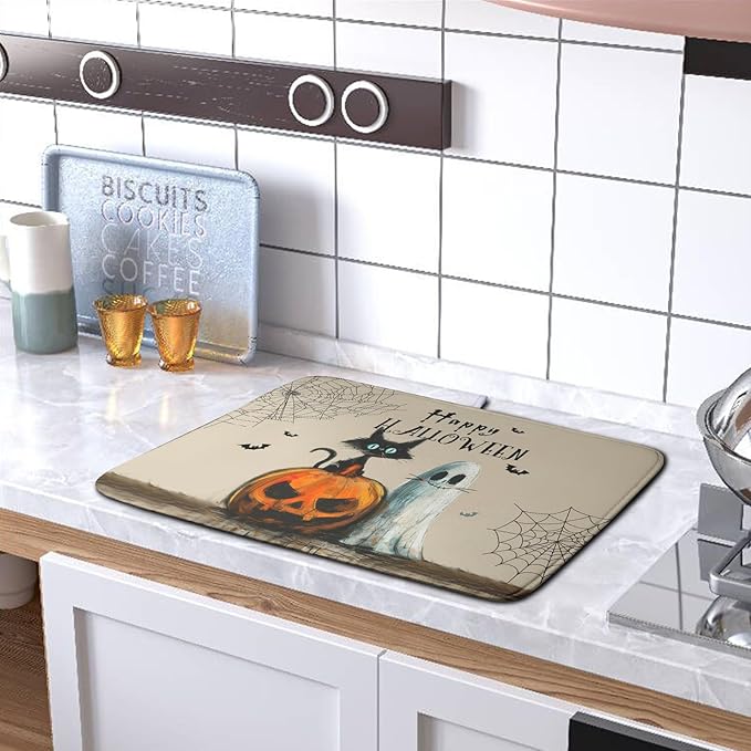Happy Halloween Dish Drying Mat for Dishs 18x24 Inch Halloween Pumpkin Ghost Black Cat Kitchen Drying Mat Spooky Spiderweb Holiday Dish Drainer Mat Super Absorbent Dish Rack Pad for Coffee Bar Sinks