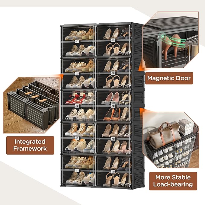 - Multifunctional storage:This collapsible shoe rack is not just limited to shoe storage. This shoe closet organizer is designed to cater to all kinds of storage needs. This clear shoe storage boxes stackable caters to all kinds of storage needs. This expandable shoe rack can accommodate standard-sized men's and women's shoes, including sneakers, flat shoes, high heels, and more. Additionally,it can be used to store and organize daily items such as books, toys, cosmetics, snacks, ect.