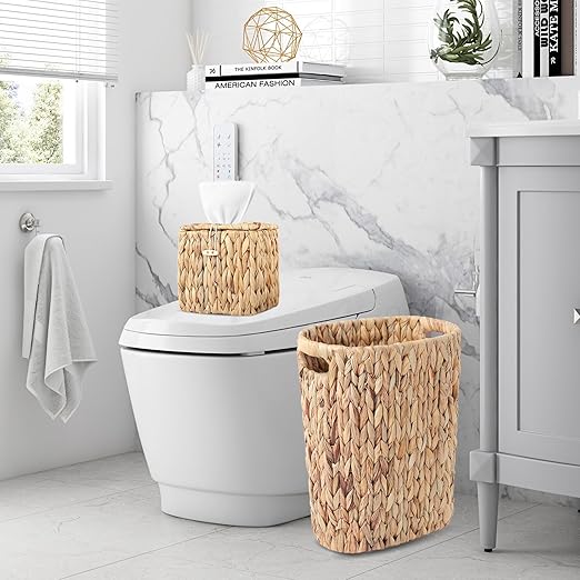 - [Waterproof and durable] The trash can and tissue box are made of high-quality water hyacinth grass material, which is tough, wear-resistant and has a long service life. Whether it is a humid kitchen, a dry living room, a bathroom with high humidity or a balcony with large temperature changes, the water hyacinth grass trash can and tissue box can remain in good condition and are not easily deformed or damaged.
