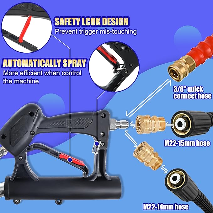 - PACKAGE INCLUDE — 1 x stainless steel power washer surface cleaner, 1 x 3/8" QC socket to M22 14mm male adapter, 1 x 3/8" QC socket to M22 15mm male adapter, 1 x 1/4”QC socket to 1/4”NPT female adapter, 1 x 1/4”QC Plug to 1/4”NPT male adapter, 2 x teflon tapes, 4 x replacement nozzles, 4 x O-rings, 1 x wrench, 1 x manual.