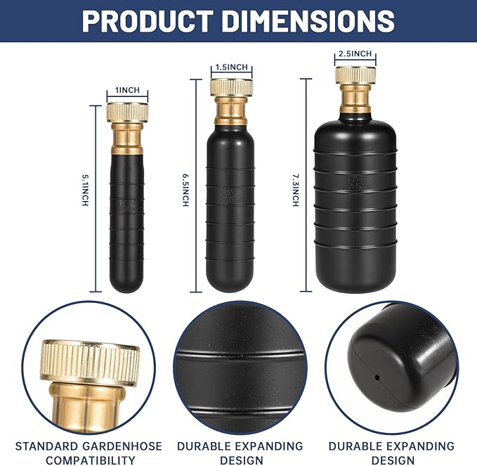 - DRAIN BLADDERS CLEANING KIT: 3 pieces of drain rubber bladders of different sizes are suitable for drain openings with a diameter of 1 to 6 inches, water expands to seal the pipe after passing through the drain bladder unclogger, pulsating jets through water pressure can quickly clear clogged drains, drain bladder Use 3/4-INCH INTERFACE STANDARD.
