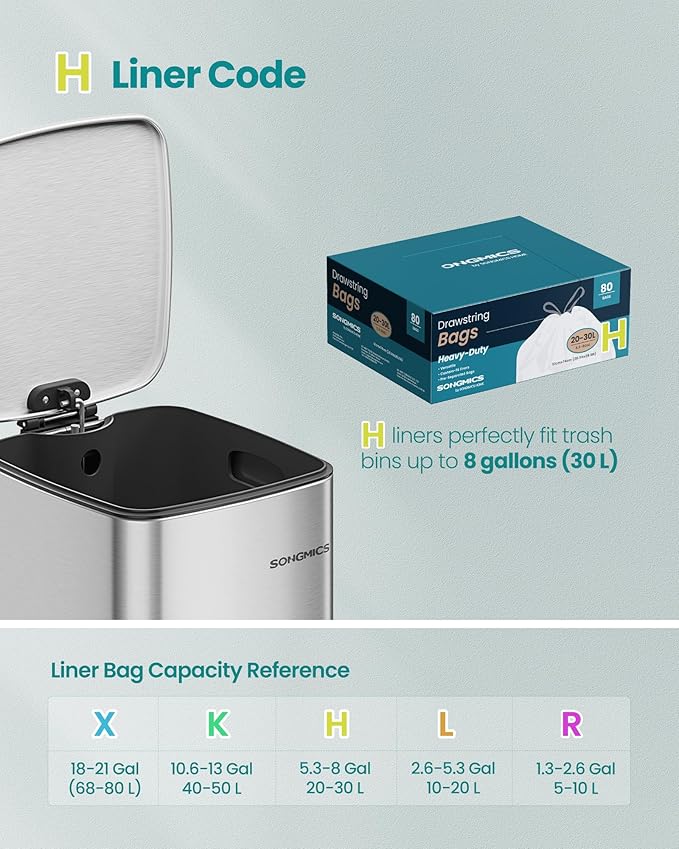 - Bag Specs: These garbage bags, sized at 20.1"W x 29.1"H with a volume of 8 gallons, come in 2 rolls of 40 pieces and are identified by the liner code H