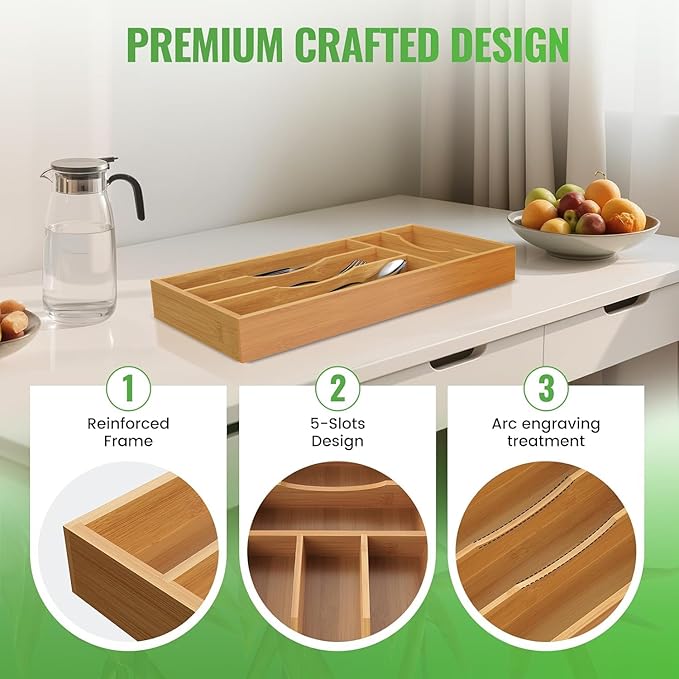 - 5-Slot Smart Design: Neatly separates dinner knives, forks, teaspoons, soup spoons, and dessert utensils. No more clattering or tangled silverware!