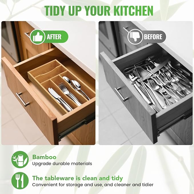 - Say goodbye to a cluttered kitchen: Are you fed up with messy drawers? When you want to access your silverware you find it scattered in various drawers? Choose this flatware organizer to keep your kitchen more organized!
