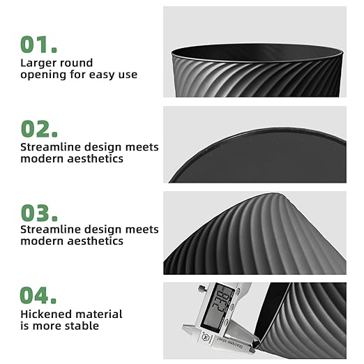 - 🚀【Sleek & Modern Curved Design】 Upgrade your space with our stylish 1.8-gallon trash cans (3-pack), featuring a unique Curved look for a contemporary vibe. Perfect for bathrooms, bedrooms, offices, or kitchens, these bins blend seamlessly with any decor while offering durable, thickened PP plastic construction.