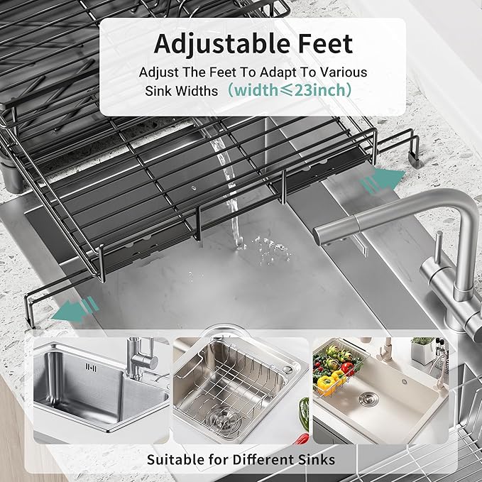 - Extendable Design - Creating 45% Extra Space: This kitchen dish rack enhances your drying area by 45% with a pull-out rack as needed. It accommodates additional cups, vegetables, pans, and pots above your sink. Measuring 5.91" in height, 16.5" in width, and adjustable in length from 16" to 24.4", it features adjustable width feet to fit sinks of varying widths (≤17.5")
