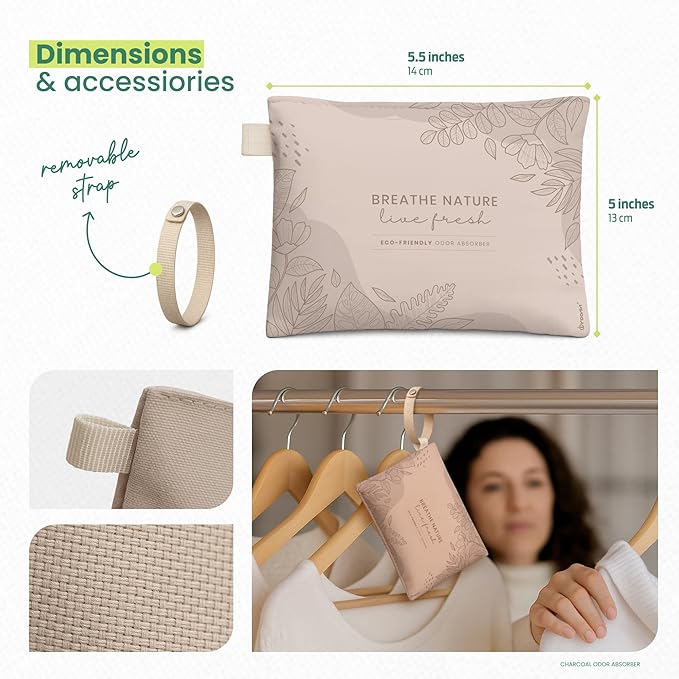 - STYLISH AIR PURIFIERS – with a minimalist, modern look, each bamboo charcoal air purifying bag features built-in hooks for easy hanging in closets or small spaces. This sleek odor absorber for strong odor works as an effective house smell eliminator, offering clean, mess-free freshness wherever it’s needed.