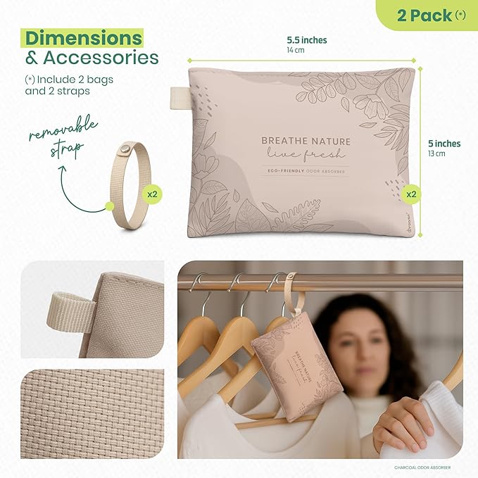 - STYLISH AIR PURIFIERS – with a minimalist, modern look, each bamboo charcoal air purifying bag features built-in hooks for easy hanging in closets or small spaces. This sleek odor absorber for strong odor works as an effective house smell eliminator, offering clean, mess-free freshness wherever it’s needed.