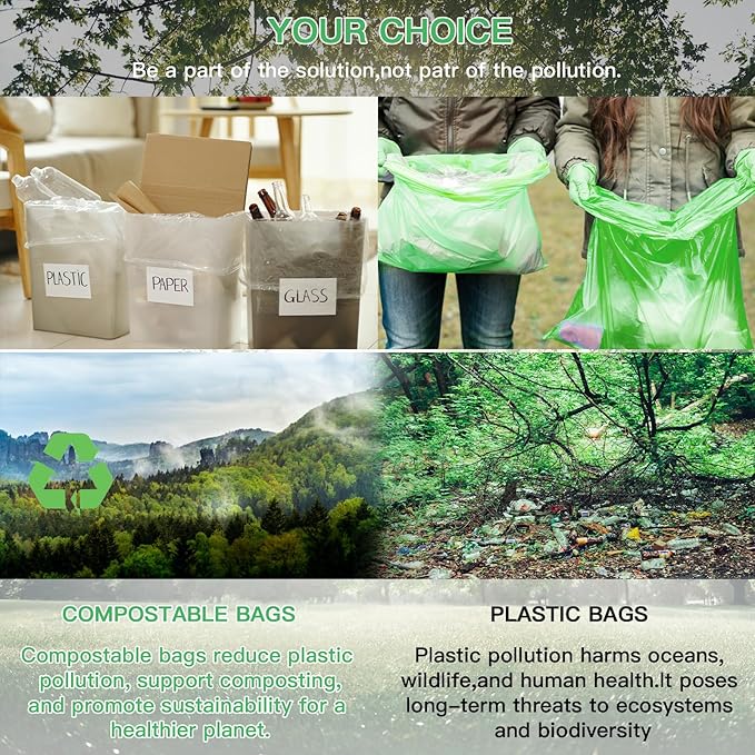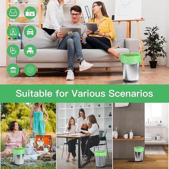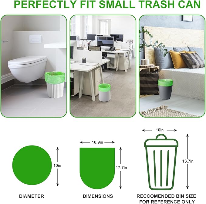 - (Fit1-1.3Gallon) Small Garbage Bags – These 1.2 Gallon Mimi Compostable Trash Bags are crafted for versatility, working seamlessly in bathrooms, kitchens, or cars. Their compact size and sturdy build make them a practical choice for small-scale waste.