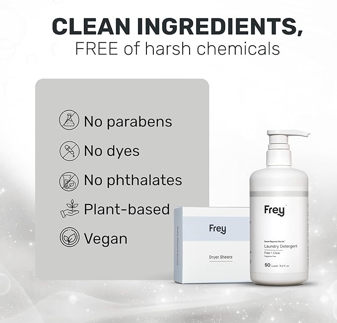 FREY Classic Laundry Bundle – Concentrated Liquid Detergent (Up to 50 Loads) + Dryer Sheets (30 Sheets) – Plant-Derived Formulation, HE Compatible (Fragrance Free)