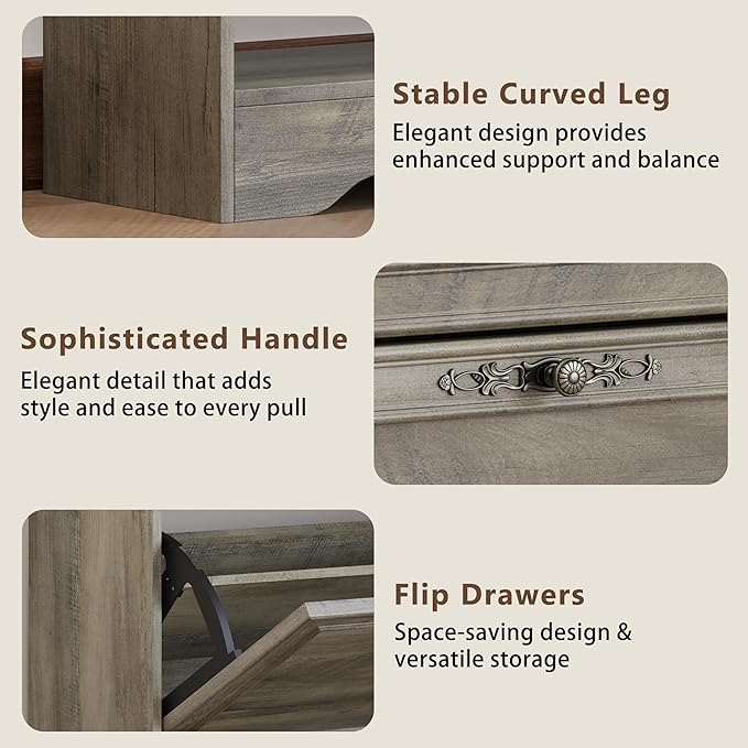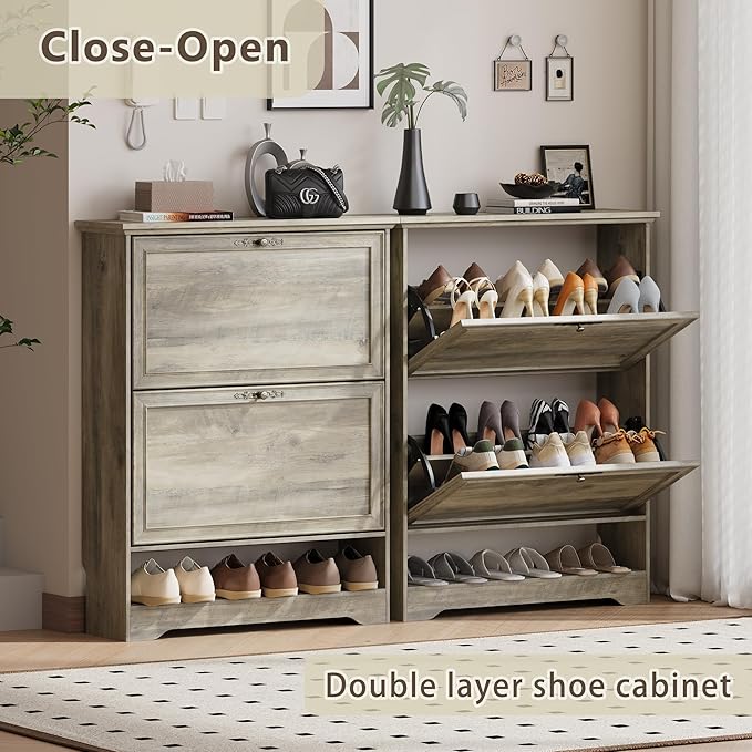 - Double-Layer Flip Drawers with Adjustable Shelves: Each drawer opens smoothly to reveal two-tier shoe compartments with removable dividers that flexibly fit sneakers, heels, slippers, or ankle boots; the top shelf works great as a tabletop to hold plants, photo frames, keys, sunglasses, or daily grab-and-go essentials.