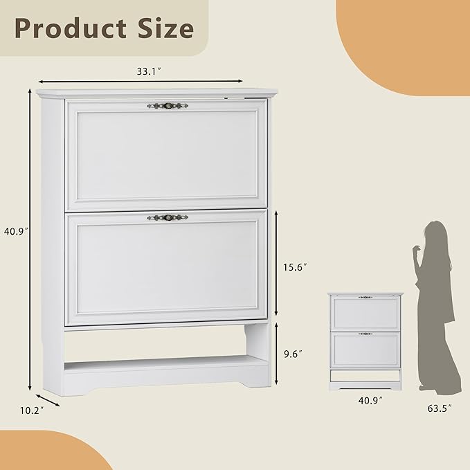 - Double-Layer Flip Drawers with Adjustable Shelves: Each drawer opens smoothly to reveal two-tier shoe compartments with removable dividers that flexibly fit sneakers, heels, slippers, or ankle boots; the top shelf works great as a tabletop to hold plants, photo frames, keys, sunglasses, or daily grab-and-go essentials.