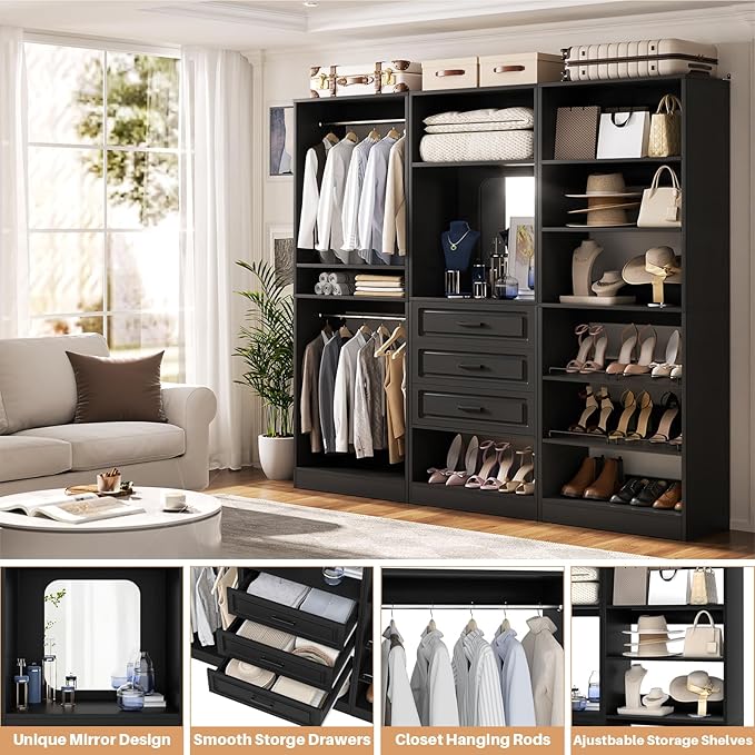 Unikito Modular Closet System with 3 Sets, 75”Closet Organizer System With Drawers, Mirror, Hanging Rods and Adjustable Shelves, Freestanding Wood Wardrobe Garment Rack, Walk in Closet Tower, Black