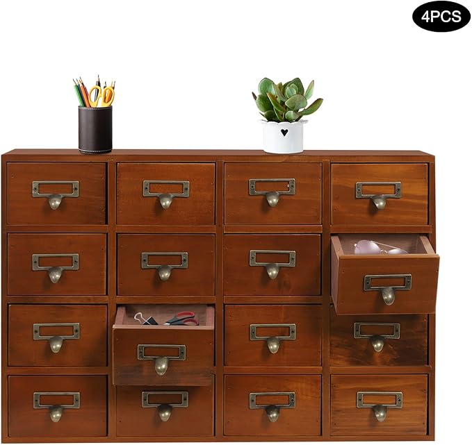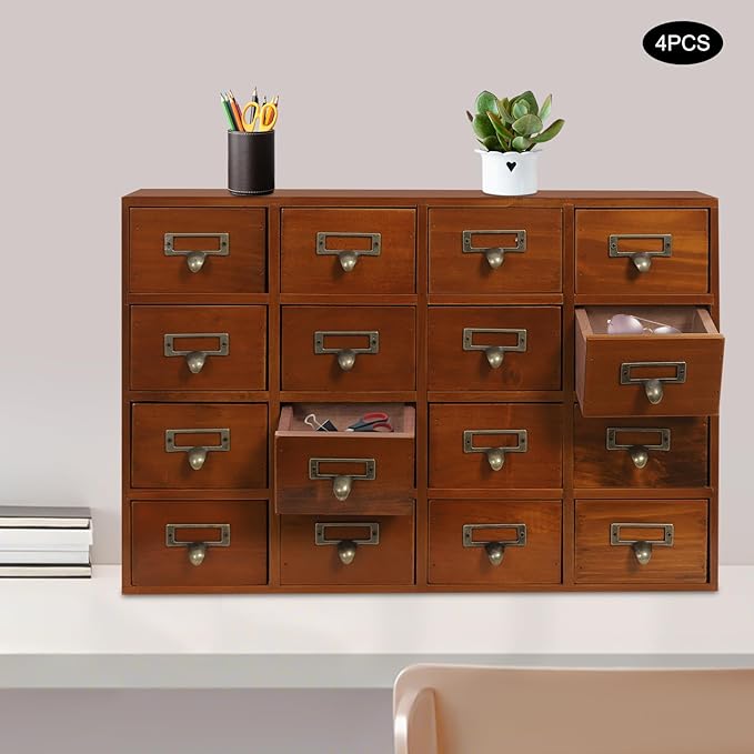 4PCS Card Catalog Desk Drawer Organizer,Wooden Vintage Apothecary Cabinet with 16 Drawers,Library Card Catalog Cabinet for Bedroom Home Office