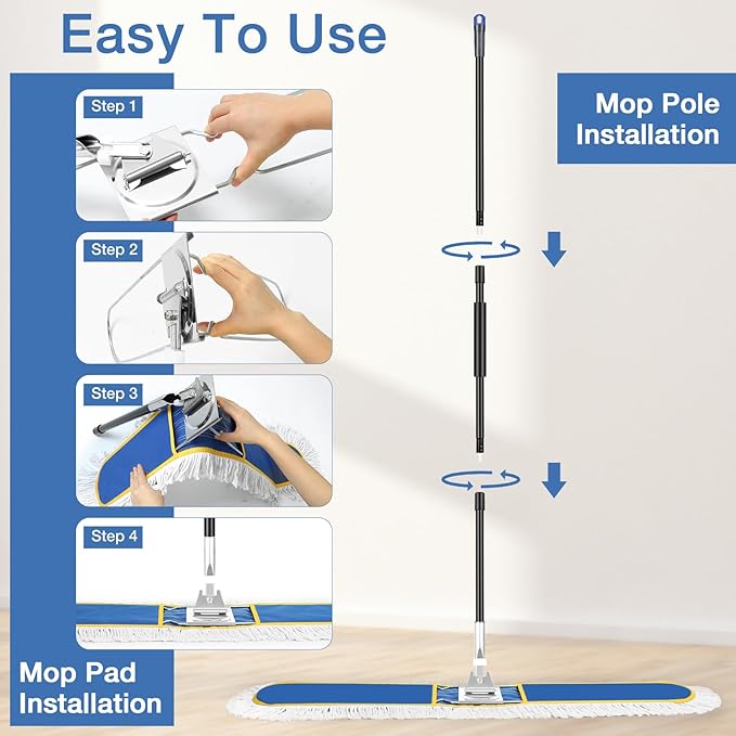 - 【Flexible Mop Head】Our commercial dust mops have 360° rotating mop head, Providing Maneuverability in Hard to Reach Places.And pull down the white lock to secure the mop head, Provide you with a variety of cleaning options