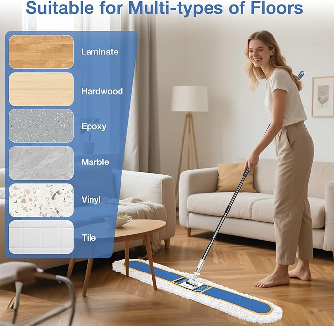 - 【Professional Industrial Dust Mop】48in large dust mop built for maintenance crews, janitors, and everyday users who need reliable performance. Janitor broom head covers more area in one pass, cutting down cleaning time effectively. Ideal for schools, offices, garages, retail settings, industrial and residential settings ect.