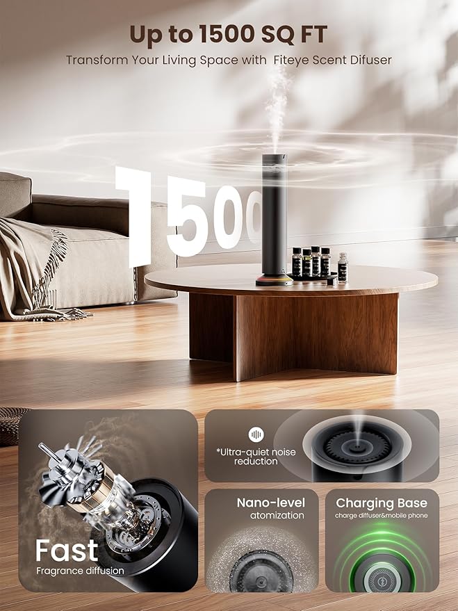 - 【Advanced Nano-Atomization Technology】Fiteye essential oil diffuser uses innovative nano-atomization technology to break down essential oils into billions of nano-sized particles, allowing them to diffuse 60% faster and more evenly than standard diffusers. Enjoy long-lasting, rich fragrance that quickly fills any room up to 1200-1500 square feet.
