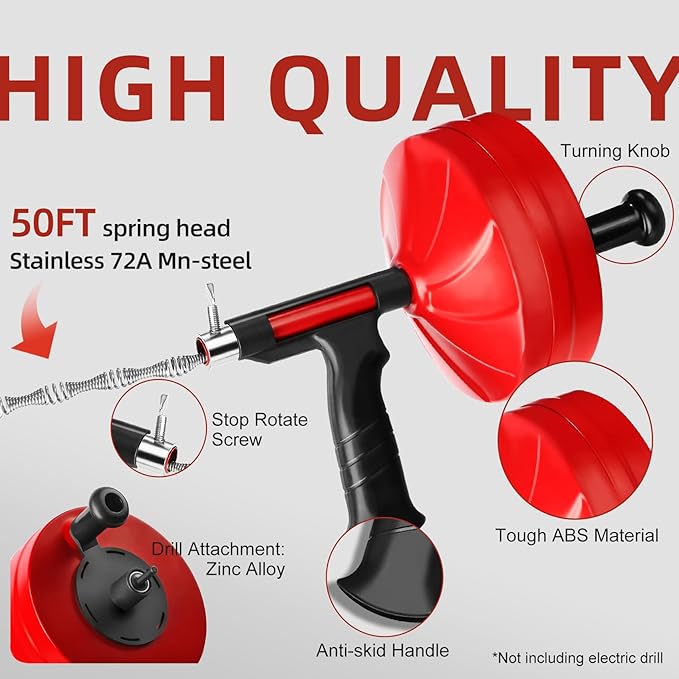 - Ultimate Drill-Powered & Manual Plumbing Snake: Effortlessly clear stubborn drain clogs with this versatile drain snake and drain auger. Use as a manual snake drain clog remover by hand cranking, or attach any electric drill (<500 RPM) for hands-free operation. This commercial-grade plumbing snake features a 50-ft flexible cable that automatically navigates U-bend, S-trap, and L-corner pipes, making it the ultimate drain snake hair drain clog remover for grease and hair—a professional toilet snake drain clog remover and sewer snake solution.