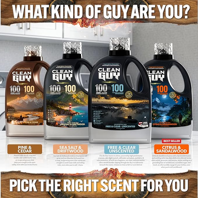 Clean Guy Laundry Detergent with Dryer Sheets | Citrus & Sandalwood Scent, Energizing Freshness, Deep Clean Technology, Soft & Fresh Clothes - Citrus & Sandalwood (100 Loads PLUS 100 Dryer Sheets)