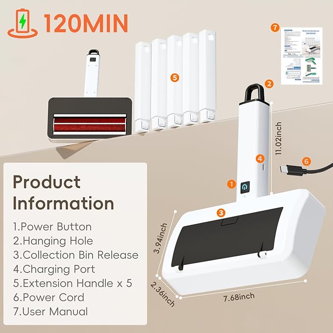 - PATENTED TECHNOLOGY: The first electric carpet hair remover with patented technology ensures premium quality and stable deep hair removal. Built-in high-capacity battery supports 120 minutes of continuous use on a single charge, enough for whole-house cleaning without recharging.