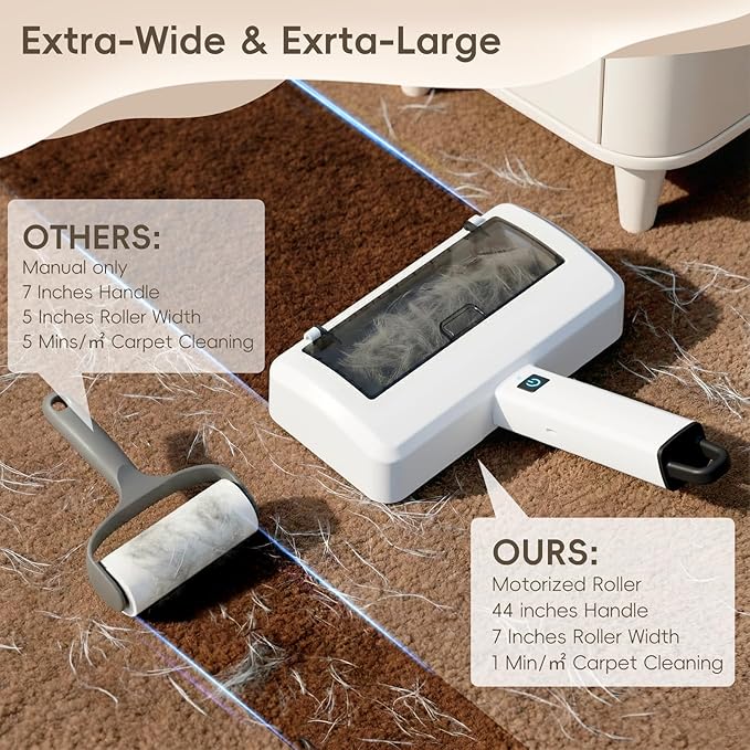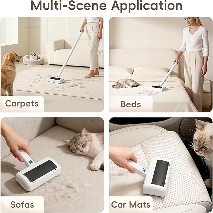 - NO MORE HAND ROLLING: Tired of pushing and pulling? No more strenuous pushing or frequent rolling - this electric pet hair remover reduces usage force by 80%, finishing cleaning in 1/3 of the time. Perfect for daily quick cleaning (only 5-10 mins/day) - busy pet owners can keep carpets hair-free effortlessly.
