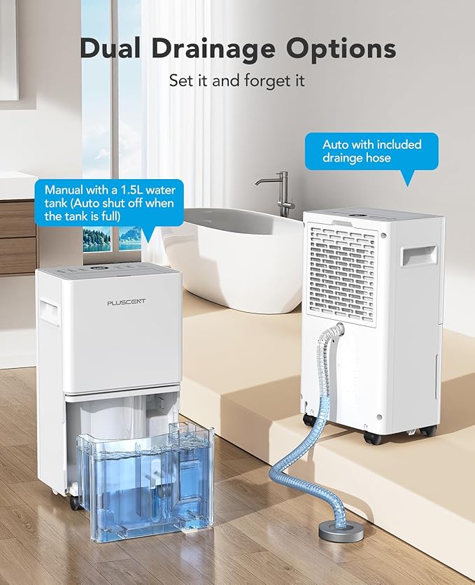 - 1.5L Auto-Stop Tank or Continuous Drain for Worry-Free Use - Designed as a basement dehumidifier, this unit offers a 1.5L auto-stop tank or continuous gravity drainage with the included 39.4-inch hose for worry-free use. Ideal for laundry rooms, basements, workshops or overnight use, helping reduce the need for frequent emptying so the unit can run smoothly with minimal attention