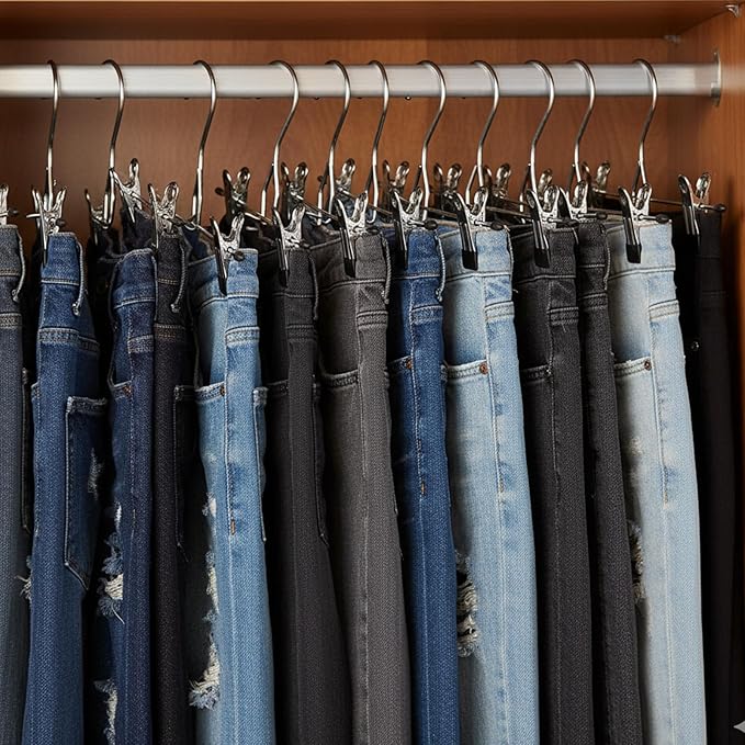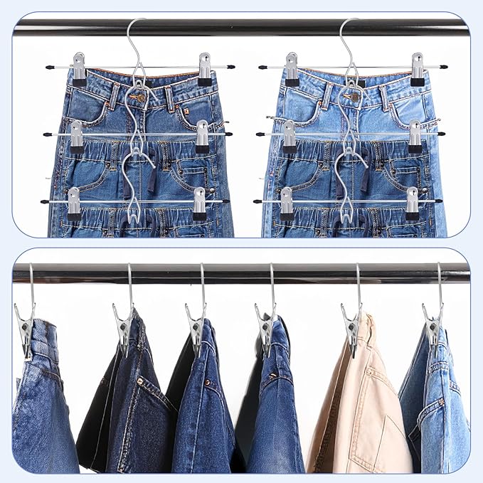 - 【Thoughtful Gift】You will get 24 hangers in a carton. The jeans organizer for closet is a practical and thoughtful gift for friends and family. It is especially suitable for people living in college dormitories or small apartments to ensure that their clothes stay neat and organized