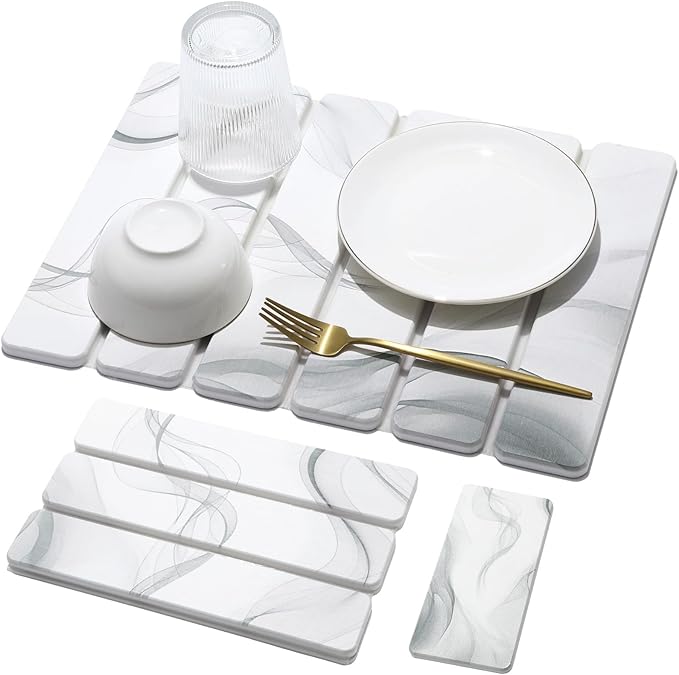 - 【Wide application】Collapsible stone dish drying mat helps maintain a clean kitchen, ensuring your surfaces stay neat and fresh. The large stone drying mat acts also as a heat-resistant mat, protecting countertops from hot pots and pans. Kitchen drying mat also doubles as a bath mat, plant saucer, or pet feeding mat, offering flexibility for various home uses.