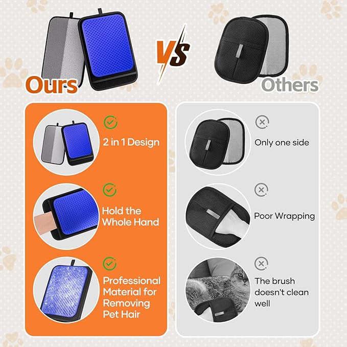 - 【Solve all Pet Hair Cleaning Problems】: From clothes to sofas, carpets or bed—this 2 in 1 pet hair removal glove is engineered to tackle pet hair on practically any fabric surface! For cats & dogs, this pet hair remover provides a soft and relaxing massage for pets while gently brushing away dirt and loose hair. Ditch the tedious rolling and spot cleaning: simply glide your hand, and experience the ease of fast, effective hair removal. Dual-Sided Design solves all pet hair cleaning problems.