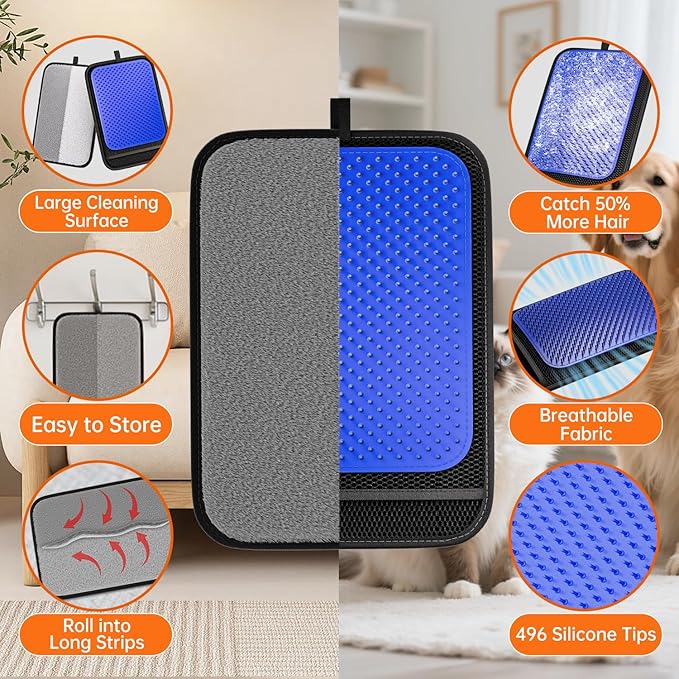 - 【2 in 1 Pet Hair Removal Glove】: Dual-Sided Design for different uses. The silicone palm side featuring 496 silicone tips, can effectively remove loose hair while massaging pets’ skin. With the effect of static electricity, the fabric side can easily remove embedded lint, pet hair and dust on couches, carpets, or car seats.