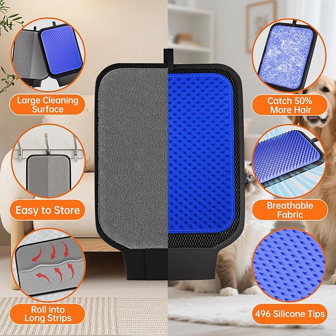 - 【2 in 1 Pet Hair Removal Glove】: Dual-Sided Design for different uses. The silicone palm side featuring 496 silicone tips, can effectively remove loose hair while massaging pets’ skin. With the effect of static electricity, the fabric side can easily remove embedded lint, pet hair and dust on couches, carpets, or car seats.