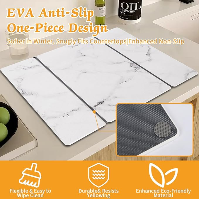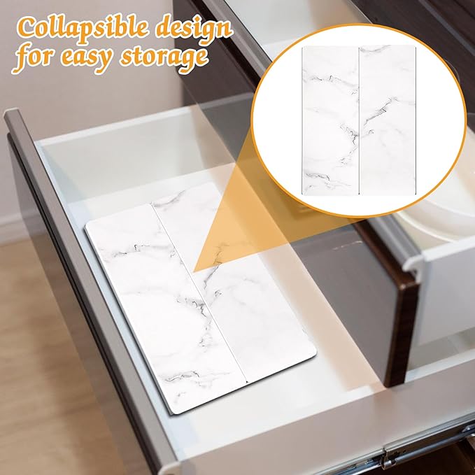 - 【UNIQUE DESIGN】Dish drying mat made with marble texture printed on the surface. It presents a simple, modern and beautiful style, suitable for a variety of kitchen decorations.Its foldable design maximizes space efficiency when not in use