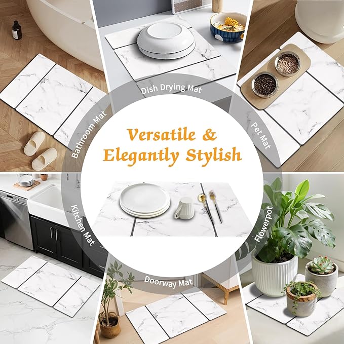 - 【WIDE APPLICATION】The large stone drying mat also serves as a heat-resistant mat, protecting countertops from scalds caused by hot pots and pans. Kitchen drying mat also doubles as a bath mat, plant saucer, or pet feeding mat, offering flexibility for various home uses